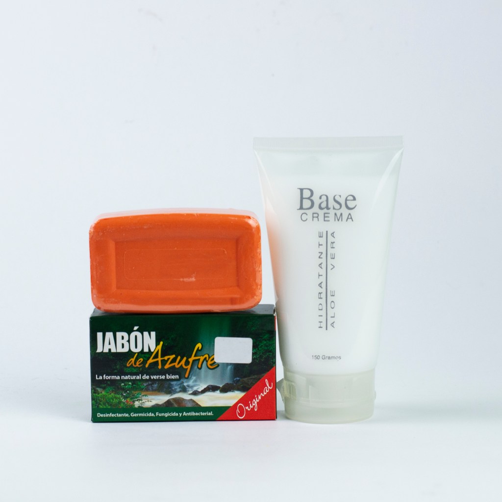 Nuestro jabón de azufre en cualquiera de sus presentaciones y nuestra Crema Base Aloe Vera.