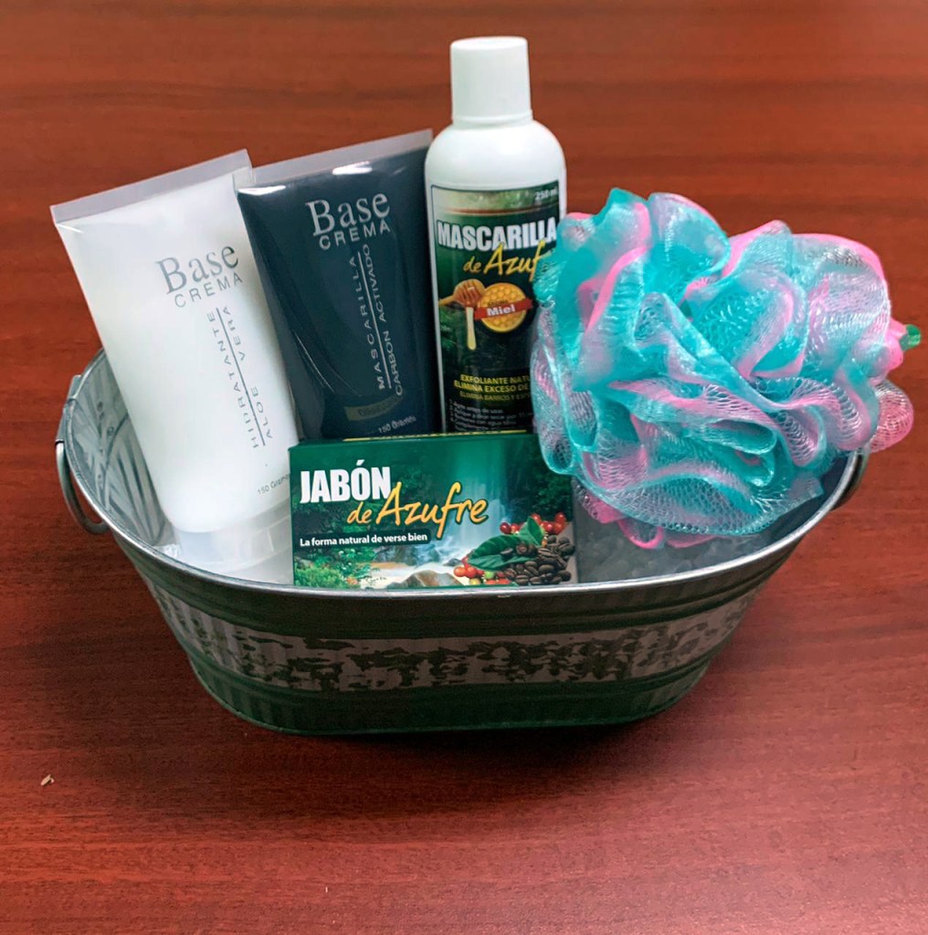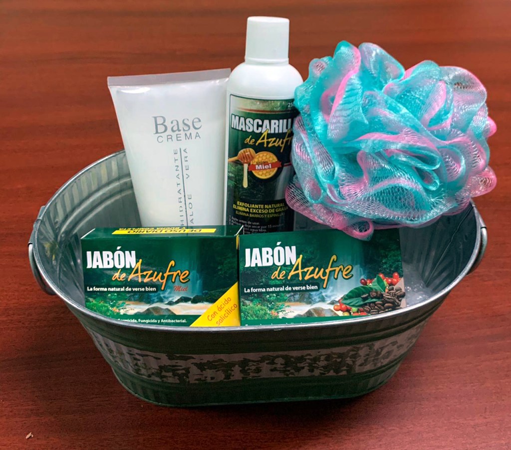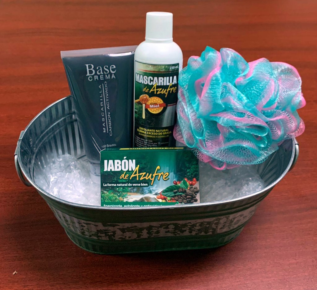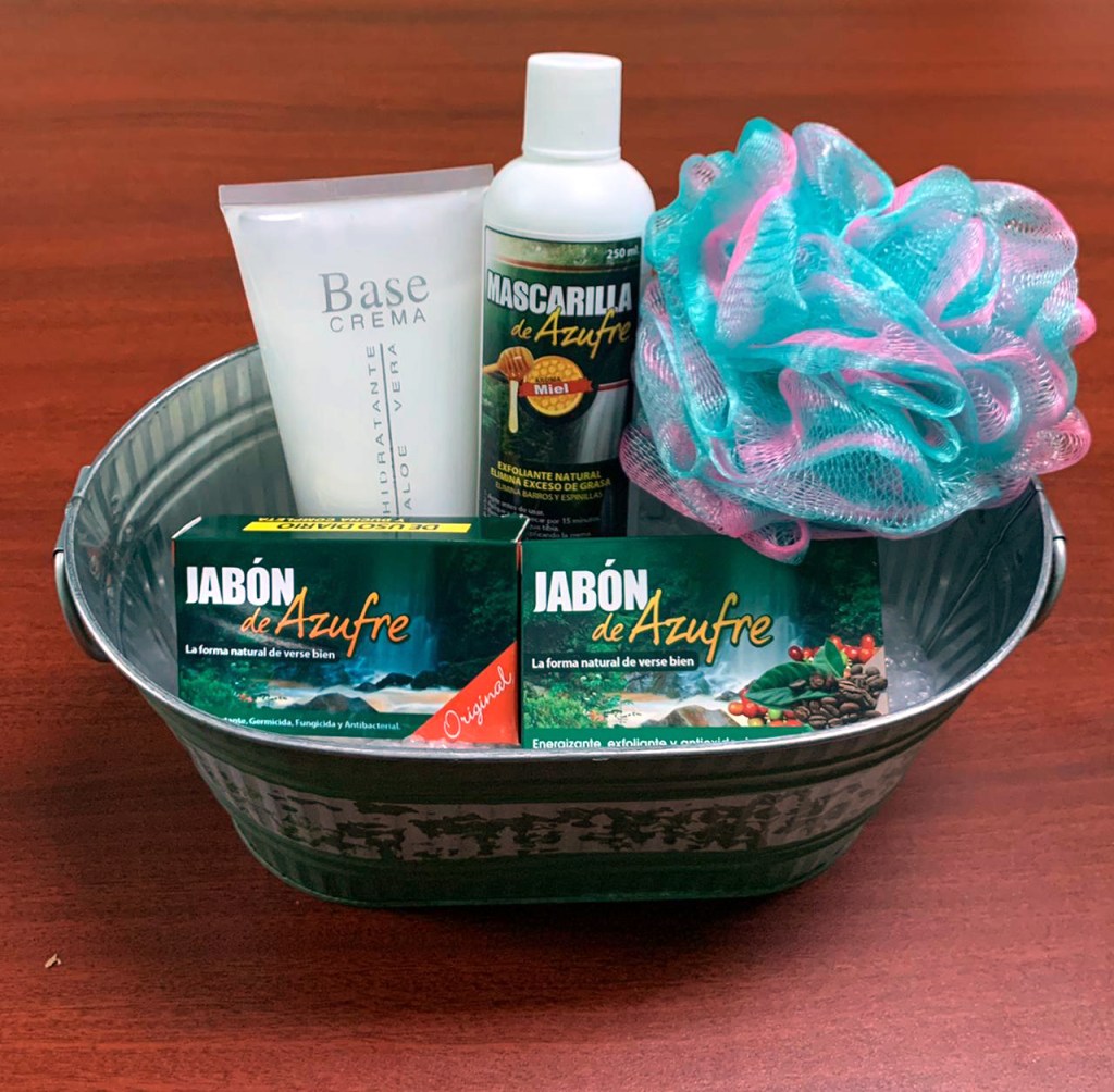Incluye: Mascarilla de Azufre, Crema Aloe Vera, Jabón de Café, un segundo jabón a tu elección (Ácido Salicílico/Original), también con una esponja de baño y una cubeta para cualquier uso.